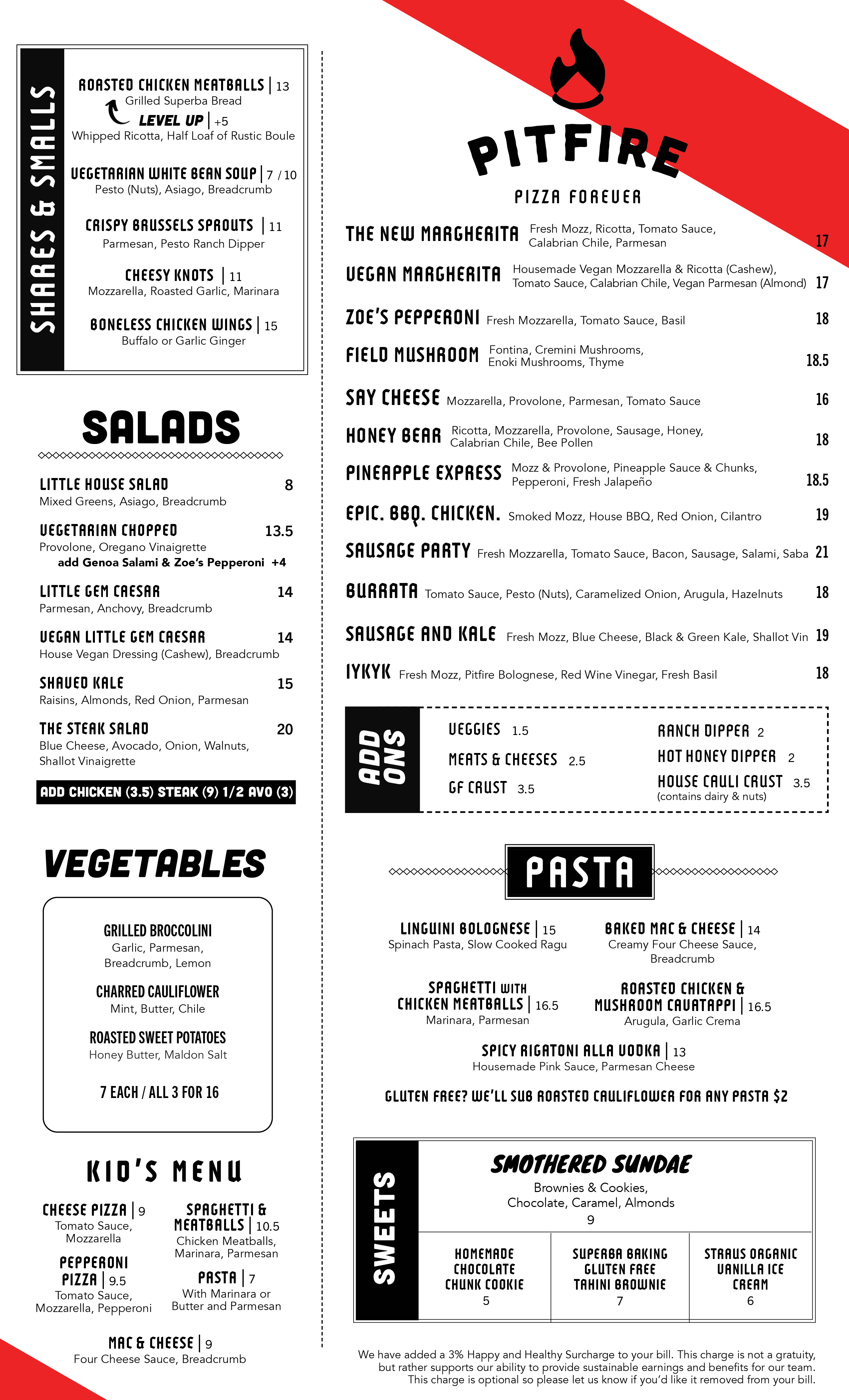 We have added a 3% Happy and Healthy Surcharge to your bill. This charge is not a gratuity, but rather supports our ability to provide sustainable earnings and benefits for our team. This charge is optional so please let us know if you’d like it removed from your bill.
